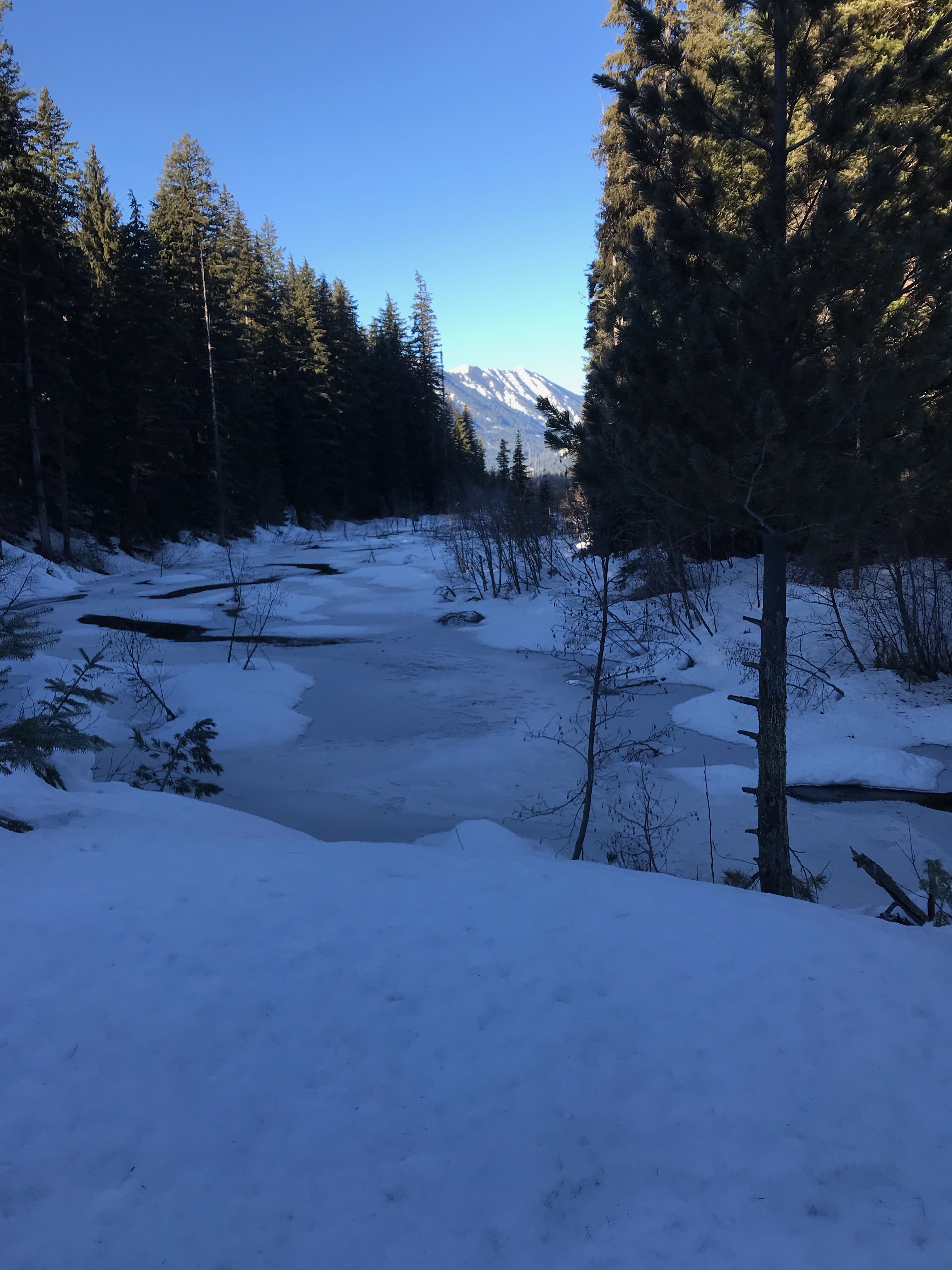 Long flat stretches and gentle uphill climbs lead to the gurgling waters of Meadow Creek at the Meadow Creek Campground. The campground itself is buried in snow this time of year, but it is a perfect place to stop for a break along the tree-lined creek.