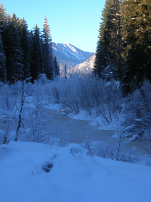 From the Sno-park, take a left onto Meadow Creek road (what the Forest Service calls Route 3). Stretch out your legs for an accommodating 0.7 mile flat stretch. The road then yanks to the right and up a hill, continuing a modest climb until flattening out a quarter mile from the intersection with Route 4 (the route to Pole Ridge). At the intersection stay to the right, dropping to cross Meadow Creek in 0.5 mile. The campground is an additional 100 feet along the road and to the right. It is easier to stay on the groomed trail, but you also can take off your skis and tromp through snow to a picnic table in the campground – exactly the sort of thing my kids would do when they were younger.