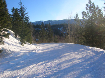 The trip consists of a loop added on to the Meadow Creek Campground trip (Trip #1), making it a lollypop route. From Meadow Creek Campground (see Trip #1), continue another 0.25 mile to an intersection. You can do the loop either way, but I like my pain short and intense, so I go clockwise when I can (i.e., when the groomer cooperates). To go clockwise, bear left onto Route 3E and begin a gradual 3 mile climb. Along this climb you pass an intersection with Route 4F that takes you across Meadow Creek on Wounded Knee Bridge and onto Jarrad's Loop (see Trip #7). Stay straight, however, onto Route 3D. After a couple miles of gradual climbing your real work begins with an intense 1 mile hill.
