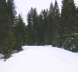 I took my then-13 year old daughter to Goose Creek Campground for her first introduction to Adventure Skate Skiing. From the Sno-park head straight north toward Trinity (what the Forest Service calls Route 2) for 1.1 mile. Along the way you cross a bridge over the Chiwawa River – a great place to stop and gawk either going out or coming back. Reach an intersection 1.1 miles from the Sno-park and turn right. In 100 feet you come to another intersection, and turn right again onto (Forest Service) Route 7. Enjoy the flat trail as it passes through a stand of Douglas Fir until you reach Goose Creek Campground on the right. The campground itself is buried in snow this time of year. You can use the flat trail around the campground to work on your skating technique, before turning around and retracing your tracks back to the car.