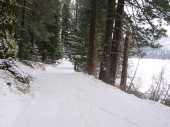 From the Sno-park, turn left onto Meadow Creek Road (what the Forest Service calls Route 3) for 150 yards until an intersection with Route 1C. Turn left and experience the thrill – or terror, if it is icy – of a twisting, screaming, albeit short ride down to the elevation of Fish Lake. From here, the trail loops counter-clockwise around the lake.