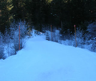 From the Sno-park, take a left onto Meadow Creek road (what the Forest Service calls Route 3). At 2.4 miles you reach an intersection and have to decide which way to take the loop. To the left is Route 4 – up to Pole Ridge (trip #10), and to the right is the way to Brush Creek (trip #8) and the Meadow Creek Full Tour (trip #11).