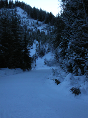The Brush Creek trail meanders slightly downhill to cross Brush Creek, then slightly uphill for a total of 3.4 miles until it simply ends. That's ok, because you can turn around and zip back over your outbound tracks. You will swear that this 3.4 mile stretch is downhill in both directions. As an added bonus, you get to ski down the 0.6 mile hill before crossing Meadow Creek.